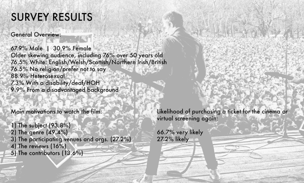 93.8% of the audience were encouraged to watch the film due to its subject matter— many of whom expressed their affinity towards the subject due to its relevance (“Fascinating piece of history, extremely relevant today” and “We still need the spirit of RAR”). A large portion of the audience also expressed their affiliation to the subject matter/RAR movement/1970s London (“Took me back to my teenage years” and “brought back good memories”).